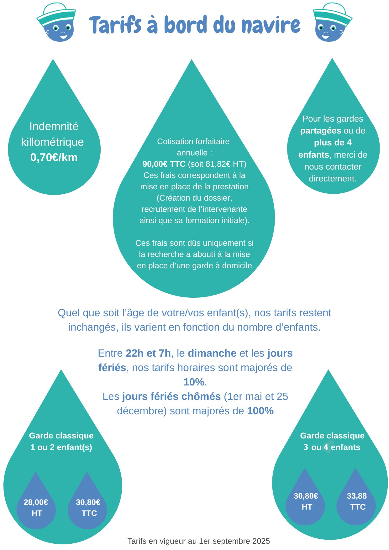 Nos tarifs sont adaptés à votre besoin et peuvent varier en fonction de l’âge et du nombre d’enfants. Pour les connaître, vous pouvez effectuer une demande de devis.
